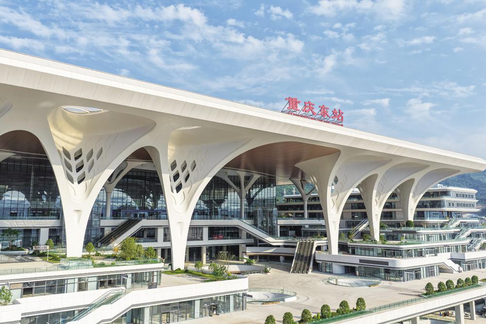 6月10日拍摄的重庆东站(无人机照片)。 6月11日,随着武隆南站内部装饰装修完成,新建重庆至厦门高铁重庆东至黔江段(渝厦高铁重庆段)7座站房(重庆东站、巴南站、南川北站、水江西站、武隆南站、彭水西站、黔江站)全面完工亮相。渝厦高铁重庆段是国家中长期铁路网规划“八纵八横”中渝厦通道的重要组成部分,从重庆站引出,途经渝中、南岸、巴南、南川、武隆、彭水等区县,止于重庆市黔江区。新华社记者 唐奕 摄