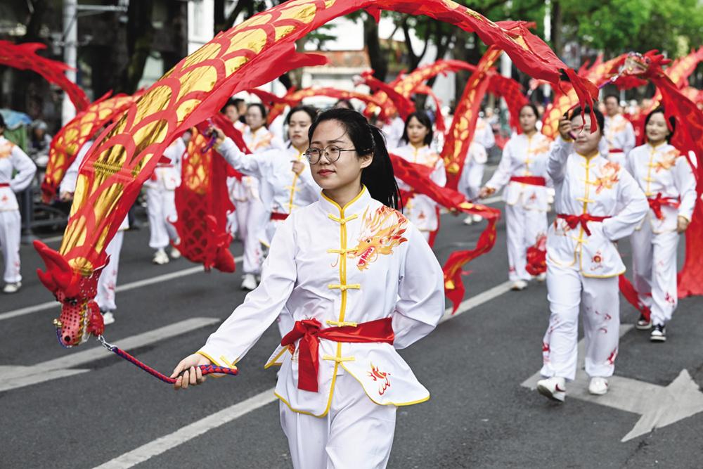 6月12日,群众在参与巡游。 当日,以“虾趣狂欢 嗨游全城”为主题的第25届盱眙龙虾节群众文化巡游活动在江苏盱眙街头举行。3.2公里的巡游线路上,欢声笑语与铿锵锣鼓交织,巨型“龙虾”、汉服等元素以及精彩的表演吸引众多市民和游客驻足观看。 地处淮河下游、洪泽湖南岸的盱眙是我国著名的龙虾之乡。经过数十年的发展,当地成功探索出“一虾先行、诸业并进”的高质量发展路径。目前,全县小龙虾养殖面积达98.5万亩。新华社记者 季春鹏 摄