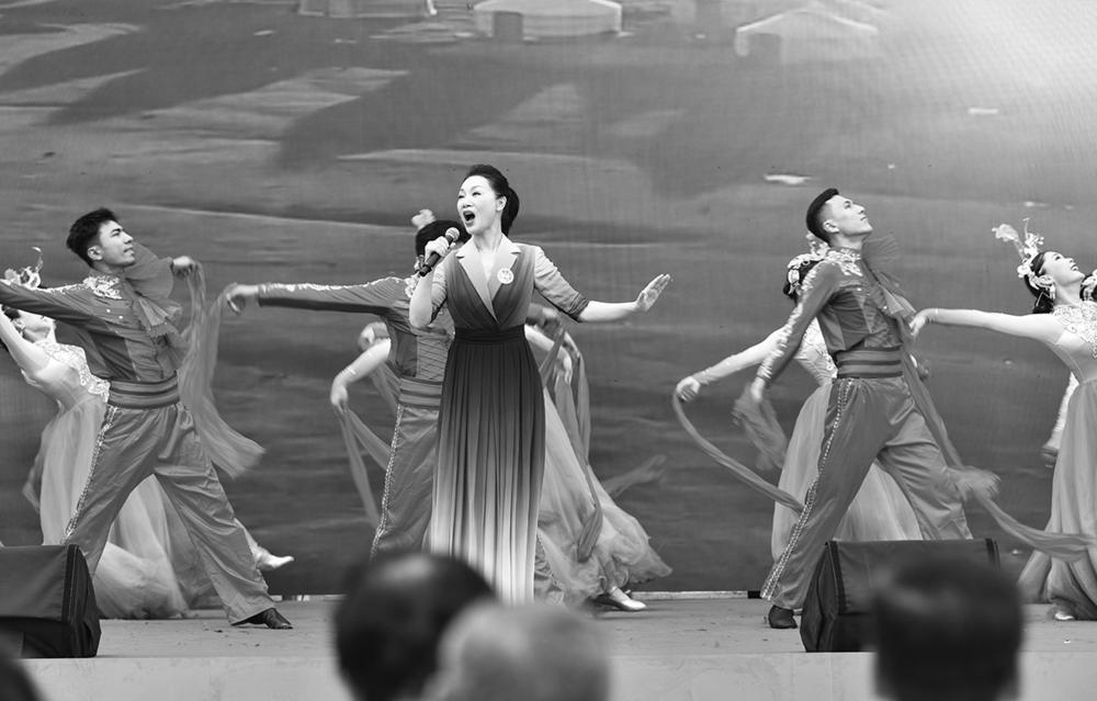 6月15日,在位于新疆霍尔果斯市第六代国门的演出现场,女高音歌唱家吕薇演唱歌曲《中国红》。 当日,中国文联文艺志愿服务队走进新疆霍尔果斯市慰问演出,多名文艺工作者为当地各族干部群众表演歌舞、相声、京剧等节目。新华社记者 胡虎虎 摄