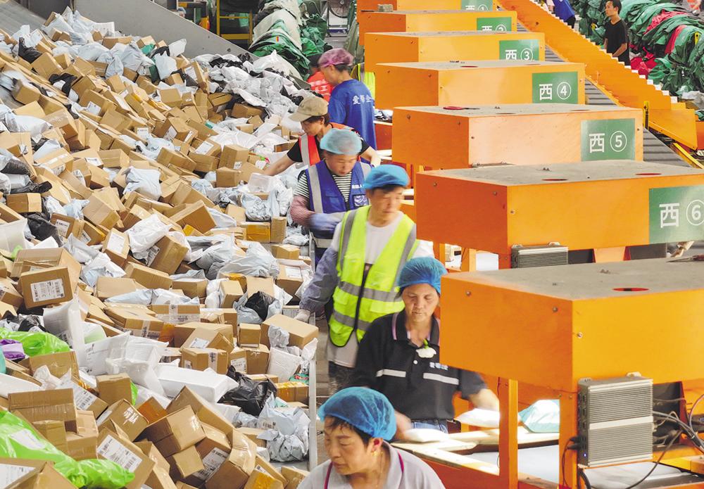 6月17日,中国邮政集团有限公司扬州邮件处理中心工作人员在分拣快递(无人机照片)。 时值电商平台“618”年中促销活动高峰,各地电商、物流等线上线下企业、商家全力应对。新华社发(孟德龙 摄)