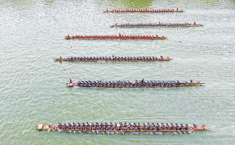 6月21日,参赛队伍在比赛中(无人机照片)。 当日,2025年粤港澳大湾区(东莞)龙舟邀请赛在东莞沙田龙舟公园举行,共有来自粤港澳三地的18支龙舟队伍参加。 新华社记者 黄国保 摄