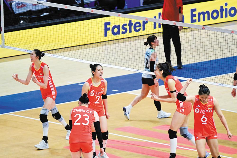 6月21日,中国队球员在比赛中庆祝得分。 当日,在2025世界女排联赛(中国香港站)比赛中,中国队3比1战胜日本队。 新华社记者 朱炜 摄