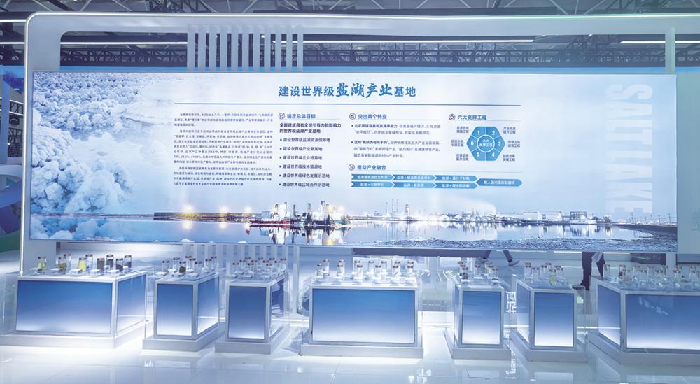 其中海西展区则围绕培育体现海西特色和优势的现代化产业体系,宣传推广“祖国聚宝盆·神奇柴达木”产业发展优势;600平方米的海西展区聚焦“浓油重盐”“风吹日晒”两大产业格局,以序章、产业四地等4大板块31张版面,集中展示盐湖化工、新能源等领域成果,430余件特色展品展示集群发展成就。而在1000平方米的世界级盐湖产业基地展区,围绕青海省核心战略,重点展现中国五矿创新成果。展区以“天地人和 协同赋能”为理念,分6大篇章全景呈现产业布局,通过可视化设计诠释盐湖产业可持续发展新模式。