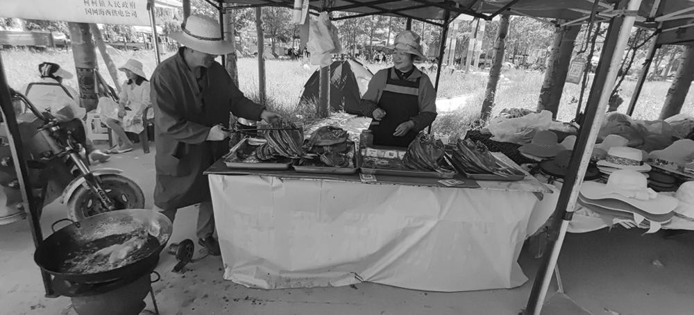 民俗文化与地摊经济就是最佳“拍档”,两者的深度融合,能最大化实现带动群众收入和扩大“花儿”影响力的“双赢”。依托“花儿会”带来的“乘数效应”,鼓励群众发展林下经济、地摊经济,会场周边小商品琳琅满目,除了有许多服饰鞋帽在售卖,还有烧烤、酿皮、凉面等各类食品应有尽有,群众穿梭其中,询价选购,熙熙攘攘、热闹非凡。欣赏“花儿”曲目的观众们或坐或站,或和三两好友聚在一起,聆听着“花儿”,品味着美食。