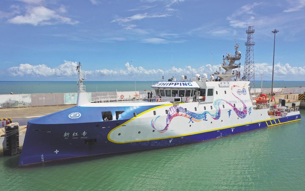 7月3日拍摄的停靠在海口新海港的“新红专”轮(无人机照片)。 当日,百川向海——“新红专”轮致敬海上丝路文化巡展在海口新海港举办公众开放日活动,观众可近距离参观全球首艘智能研究与教学实训两用船“新红专”轮。据了解,“新红专”轮配置有智能航行、智能平台等6大智能系统,实现了驾驶、轮机、电气等设备深度融合,能实现自主操作。新华社记者 郭程 摄