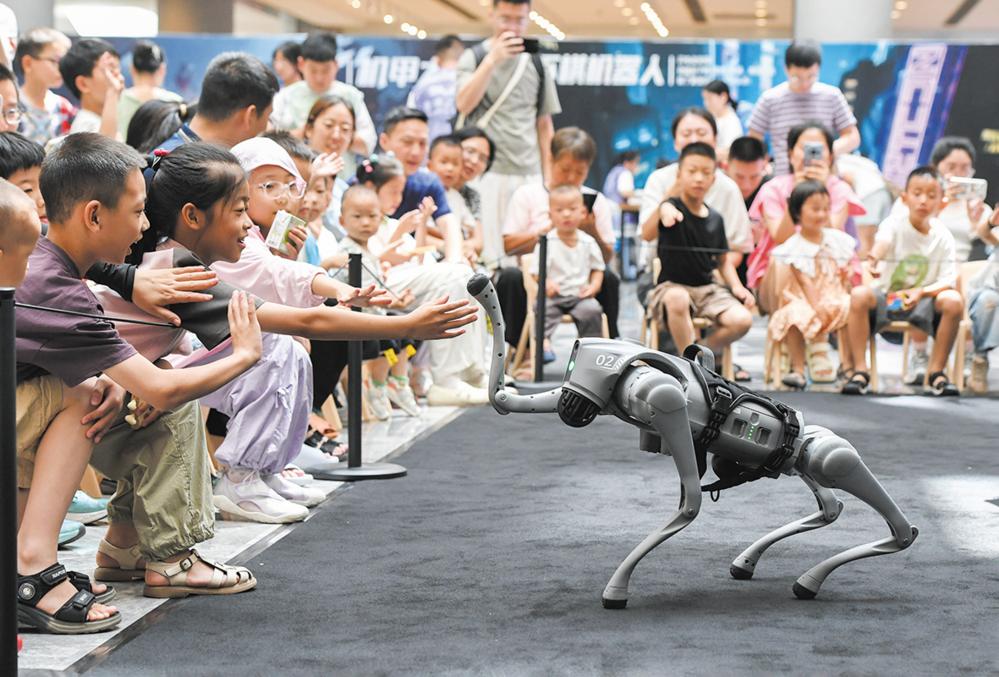 7月6日,浙江省金华市金华之光文化广场科技馆内,小朋友与智能机器狗互动。 当日,浙江省金华市金华之光文化广场科技馆举办AI智能机器人科普展,吸引了许多家长带着小朋友与人形机器人、智能机器狗、下棋机器人、足球机器人等互动,沉浸式感受人工智能技术的魅力,乐享暑期生活。 新华社发(时宽兵 摄)