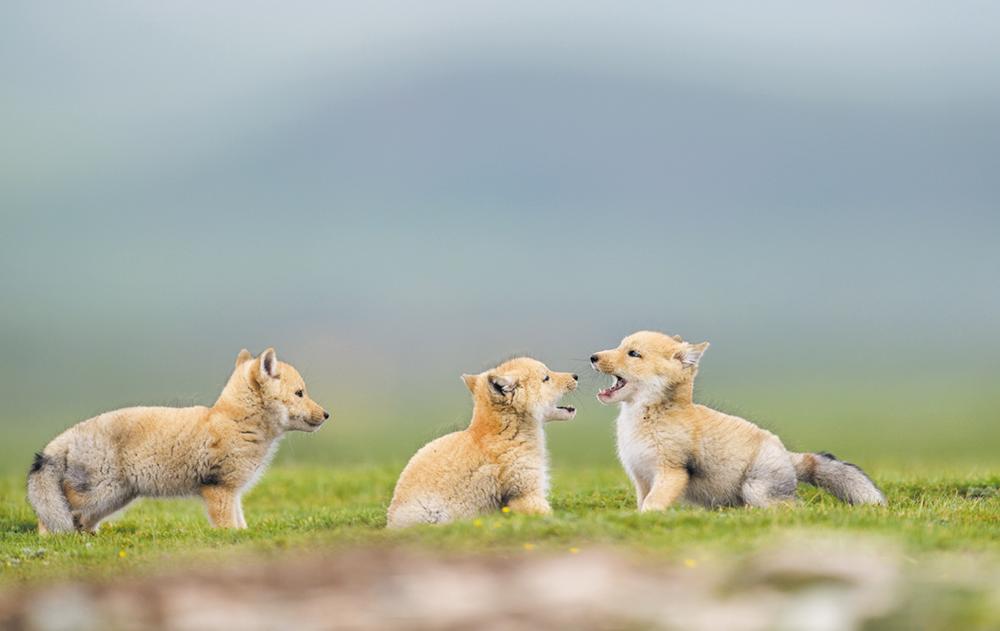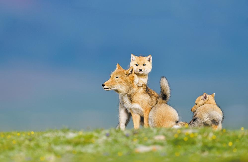 只见镜头中,成年藏狐警惕地巡视周边,三只幼崽在洞穴附近嬉戏打闹,毛茸茸的身影在蓝天碧草的映衬下更显活泼可爱,它们时而恣意奔跑,时而依偎撒娇,时而昂首观察……