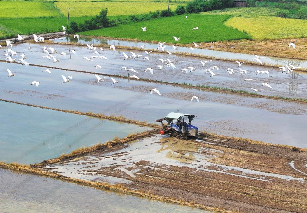 7月13日,湖南省衡阳市衡东县霞流镇农民驾驶农机翻耕稻田(无人机照片)。 时下正值“双抢”大忙季节,湖南省衡阳市衡东县农民抢抓农时翻耕稻田、抢插晚稻。新华社发 曹正平 摄