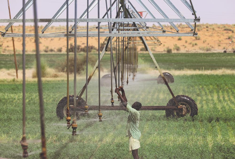 近日,在毛里塔尼亚伊迪尼村,牧民在中国援毛里塔尼亚畜牧业技术示范中心的紫花苜蓿田检查喷灌设备的运行情况。 毛里塔尼亚80%以上的国土被沙漠覆盖,炎热干旱,土壤贫瘠,风沙肆虐,植物不易生存。2017年,中国援毛里塔尼亚畜牧业技术示范中心技术合作项目在伊迪尼村正式启动。多年来,中国专家成功引种紫花苜蓿,实现规模化种植,解决了当地饲草料短缺问题。随后,多个牧草品种陆续在撒哈拉沙漠推广。在奶牛养殖与育种方面,示范中心与国内牧业公司开展技术合作,选育适应性强、耐粗饲的种牛,提高了牧区的养殖效益,为改善牧民生活、推动当地畜牧业可持续发展做出积极贡献。新华社记者 韩旭 摄
