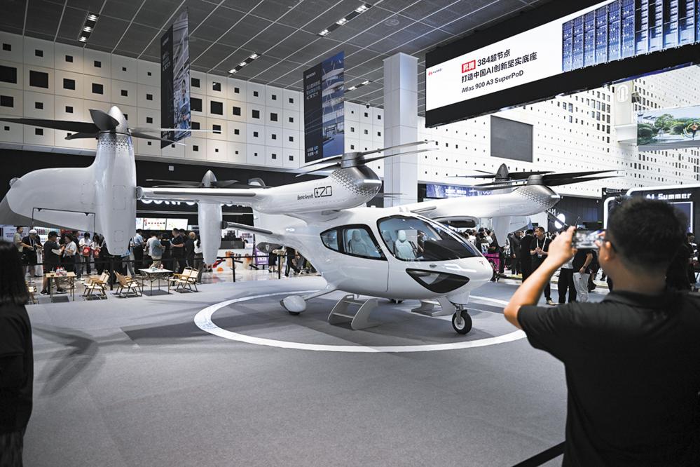 这是7月26日在2025世界人工智能大会拍摄的时的科技电动垂直起降飞行器。据工作人员介绍,该产品具备智能驾驶功能。 当日,2025世界人工智能大会暨人工智能全球治理高级别会议在上海开幕。本届大会以“智能时代 同球共济”为主题,包括会议论坛、展览展示、赛事评奖、应用体验、创新孵化等五大板块。大会展览面积首次突破7万平方米,吸引800余家企业参展,展出3000余项前沿展品,规模创历届之最。 新华社记者 陈浩明 摄