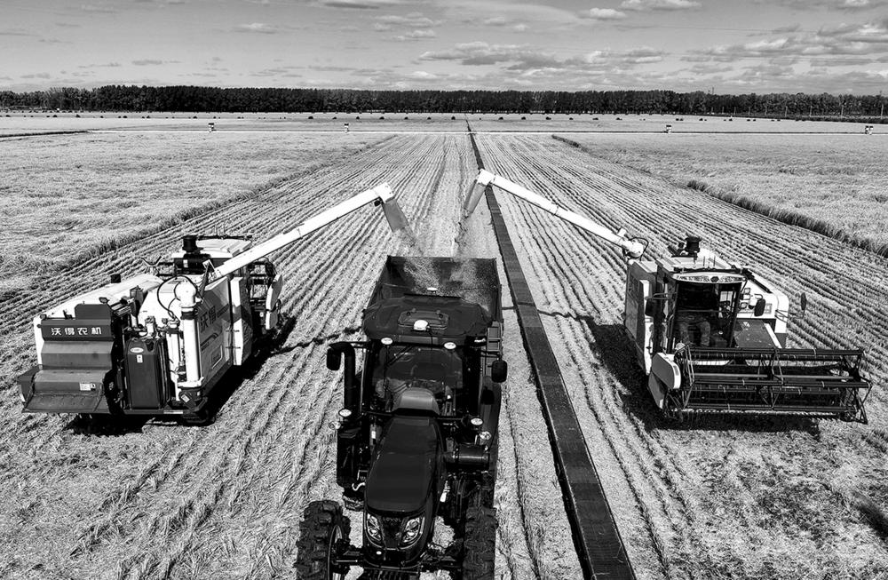 10月8日,在黑龙江北大荒农业股份有限公司友谊分公司水稻地块,农机在集中卸粮(无人机照片)。 寒露时节,黑龙江省各地抢抓农时忙农事,田间地头一片繁忙景象。 新华社发(徐宏宇 摄)