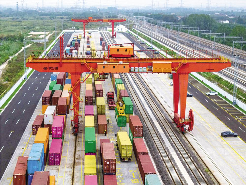 ?10月13日,在江苏省扬州市江都商贸物流园铁路物流基地,大型起重设备在起吊集装箱,这些集装箱将通过海铁联运列车发往上海芦潮港准备出口(无人机照片)。 10月13日,海关总署发布数据显示,今年前三季度,我国货物贸易进出口总值33.61万亿元,同比增长4%,比前8个月加快0.5个百分点。 新华社发(任飞摄)