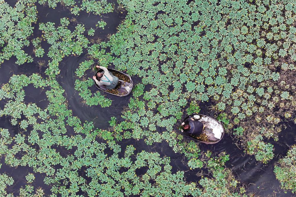 10月22日,浙江省湖州市吴兴区东林镇泉心村村民划着菱桶采摘菱角(无人机照片)。新华社发(何伟卫 摄)