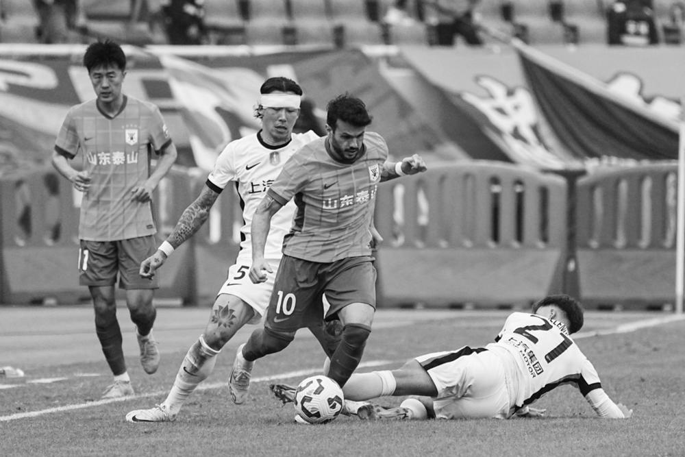 10月26日,山东泰山队球员卡扎伊什维利(右二)在比赛中突破。 当日,在2025赛季中国足球超级联赛第28轮比赛中,山东泰山队主场3比1战胜上海海港队。 新华社记者 朱峥 摄