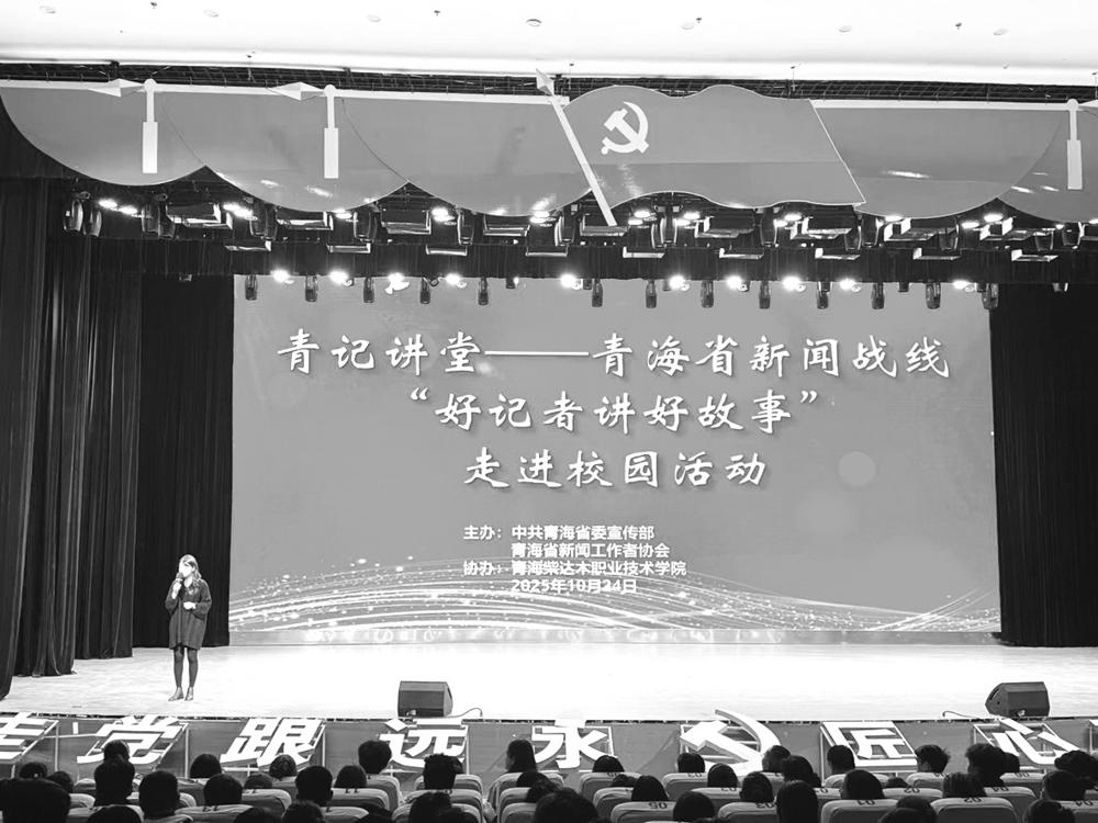 现场,青海广播电视台记者程格以《童心越山海,千里送大爱》为题,讲述了河北籍儿童赵泽琦和青海孩子吕芳跨越千里的友情,两个孩子用最纯粹的善意,完成了一场跨越山河的温暖奔赴;青海广播电视台记者朱晓宁带来了《以青春之笔,书写高原奋斗答卷》的精彩演讲,故事讲述了国能青海黄河玛尔挡水电站的建设团队,他们数十年如一日,坚守在施工现场,最终圆满完成建设任务,用实际行动和担当诠释了“青春、奋斗”的深刻含义;西宁市融媒体中心记者蒋莹以《从“酸啾啾”到“金果果”》为题,用生动轻松的语言讲述了自己5年间与青海沙棘的不解之缘,通过采访沙棘的种植、研发、精深加工、产品销售等环节,见证了沙棘如何一步步成为增收致富的“金果果”;玉树州融媒体中心记者旦周尼玛以《江源少年的足球梦》为题,深情讲述了曲麻莱县高原少年对足球的热爱和勇敢追逐足球梦,展示了只要心中有光,足球梦就一定会照进现实的感人故事;海北州广播电视台记者德吉为大家带来的是《金银滩上的老兵印记》,她通过采访曾经在中国第一个核武器研制基地奋斗过的三位老兵,当耄耋之年的他们再次走进基地,过往的岁月历历在目,他们泪眼婆娑,让现场的师生们也深受感染;黄南州融媒体中心记者裴赟讲述的是《让非遗“活”起来 传下去》,讲述了一位热贡刺绣技艺非遗传承人和盲人剪纸技艺大师的故事,他们“一针一线,一支一剪”,都展示了对生活的热爱,每一幅作品无不体现出浓浓的“家国情怀”;祁连县融媒体中心记者王建国的《追寻云端牧歌,守望绿色家园》,生动讲述了祁连县黑河源头管护站夫妻档管护员叶金俄日、东木错,19年坚守在平均海拔4000米的管护站,和在祁连山国家公园候选区青海片区青阳沟巾帼管护队的故事,这些故事展现了管护员们不辞辛劳,毫无怨言,只为守护绿水青山的精神。