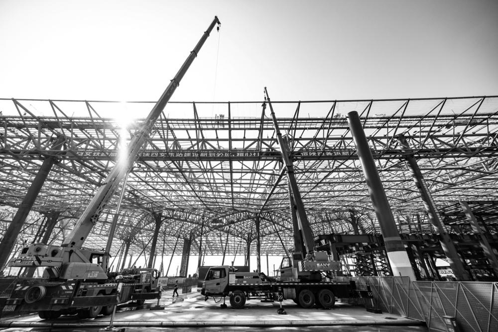 10月27日拍摄的特大型铁路综合交通枢纽西安东站建设现场。 10月27日,西安东站最后一块总重达4800吨的屋盖钢结构桁架顺利提升至33米高空指定位置,标志着西安东站站房主体结构顺利完工。西安东站是集高铁、普铁、地铁、公交于一体的综合交通枢纽,建成投用后车站旅客年发送量预计可达3650万人次。 新华社发(刘翔 摄)