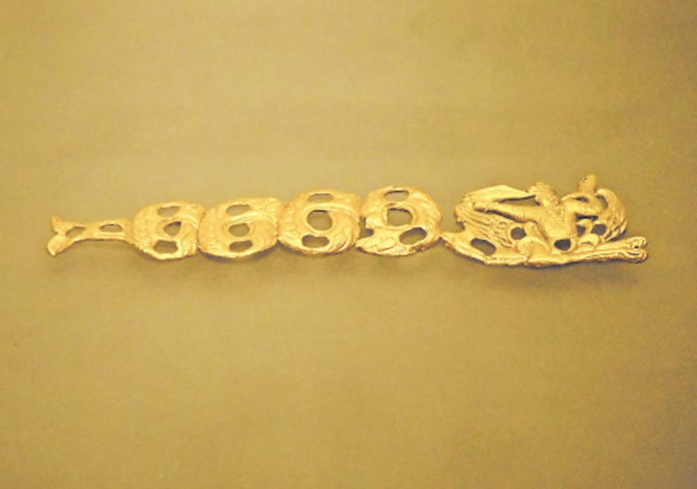 出土于都兰县的人身鱼尾金饰片。青海日报记者 李庆玲 摄