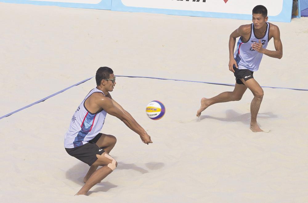 11月6日,辽宁一队组合李焯新(左)/薛涛在比赛中。最终,他们2比0战胜新疆一队组合哈力克江/萨拉木,晋级1/4决赛。 当日,第十五届全国运动会沙滩排球男子1/8决赛在香港维多利亚公园进行。 新华社发(卢炳辉 摄)