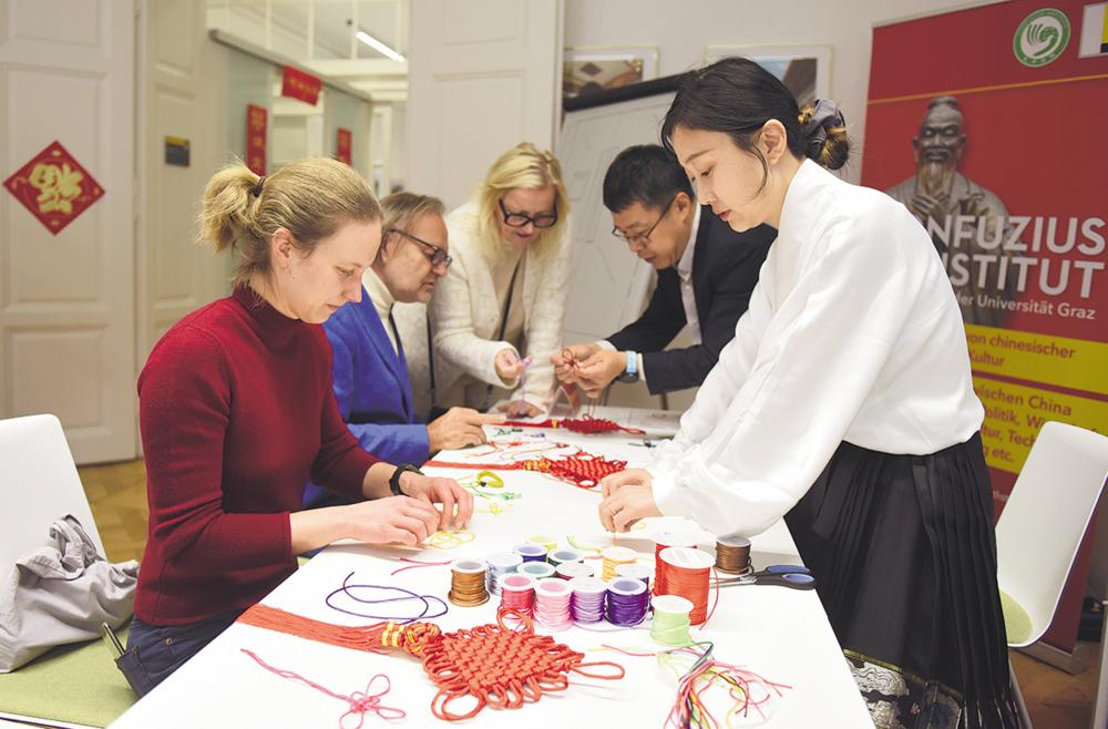 近日,人们在奥地利格拉茨大学孔子学院体验制作中国结。 近日,奥地利格拉茨大学孔子学院成立15周年庆祝活动在格拉茨举行。 新华社记者 贺灿铃 摄
