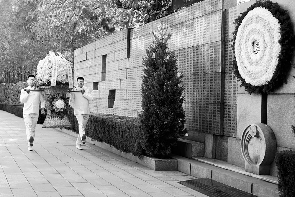 这是11月30日拍摄的南京大屠杀死难者家庭祭告活动现场。 11月30日,南京大屠杀死难者家庭祭告活动在侵华日军南京大屠杀遇难同胞纪念馆遇难者名单墙前举行,南京大屠杀幸存者刘民生、夏淑琴参加家祭活动。新华社发(刘臻睿 摄)