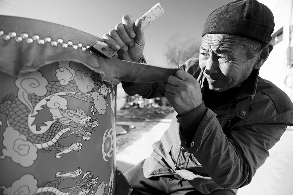 11月27日,手工艺人周天成切割牛皮。 冬日农闲时节,在甘肃省定西市安定区凤翔镇北廿铺村,牛皮鼓手工制作艺人利用晴好天气赶制订单牛皮鼓,供应市场。该村每年可制作各类牛皮鼓3000余面,牛皮鼓手工制作涵盖选材、解板、刨制鼓腔、蒙皮、钉钉等多道工序,再经数天晾晒和反复调试才能最终制成。牛皮鼓是我国的传统打击乐器,在西北地区用于民间社火表演等活动。新华社发(王克贤 摄)