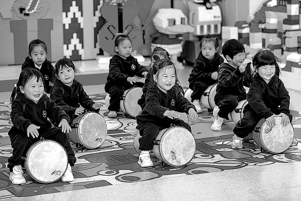 山东青岛恒星科技学院恒星托育中心,托育班的小朋友在学习非洲鼓。 张鹰 摄(新华社发) 发展托育服务是促进人口高质量发展和生育友好的重要举措。“十四五”时期,我国大力推进托育服务体系建设。目前,全国共有12.6万家托育服务机构,提供的托位总数达665.7万个,我国每千人口拥有3岁以下婴幼儿托位数已达4.73个,超额完成“十四五”规划提出的目标。 这正是: 托位架虹桥, 良策护稚苗。 担释两肩轻, 启智向明朝。 文/徐之