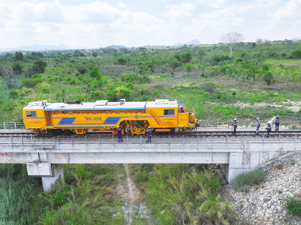 近日,中铁二十局捣固车对莫桑比克纳卡拉走廊铁路进行养护(无人机照片)。新华社记者 刘杰 摄