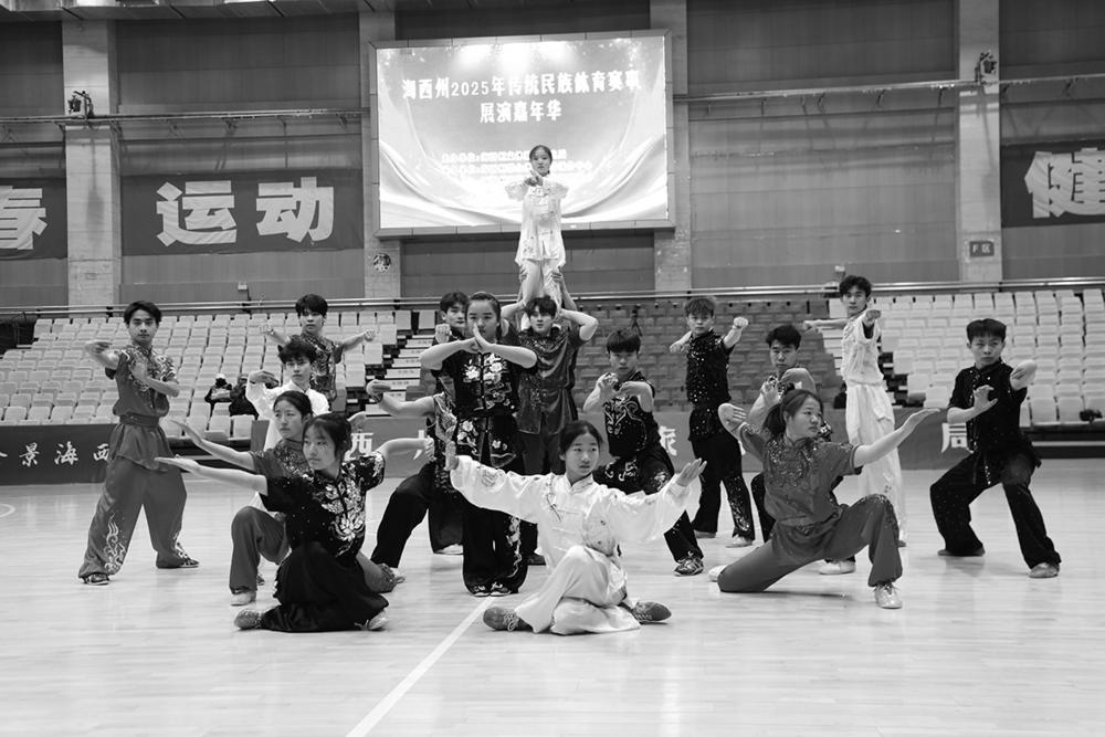 比赛前,进行了传统武术展演。多种拳种轮番登场,刚柔并济的招式尽显武术豪迈,融入多民族文化特色的套路舒展大气。表演者们拳脚生风、身法灵动,展现了“展打斩劈”的硬核技法,传递着自强不息的武术精神,让观众沉浸式感受武术的深厚底蕴与传承活力。格尔木市代表队的张博鸣说:“武术是刻在中国人骨子里的力量,为了准备展演,我们早早排练、打磨动作,力求完美呈现,希望武术能在新时代焕发新活力!”