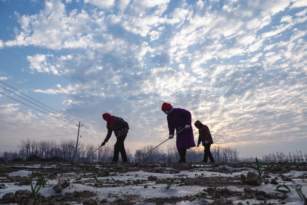 12月7日,农民在河南省商丘市夏邑县会亭镇张桥村大蒜种植基地劳作。新华社发(王高超 摄)