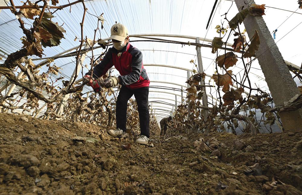②12月7日,农民在河北省石家庄市新华区陈村葡萄采摘园里剪枝管护。 新华社发(陈其保 摄)
