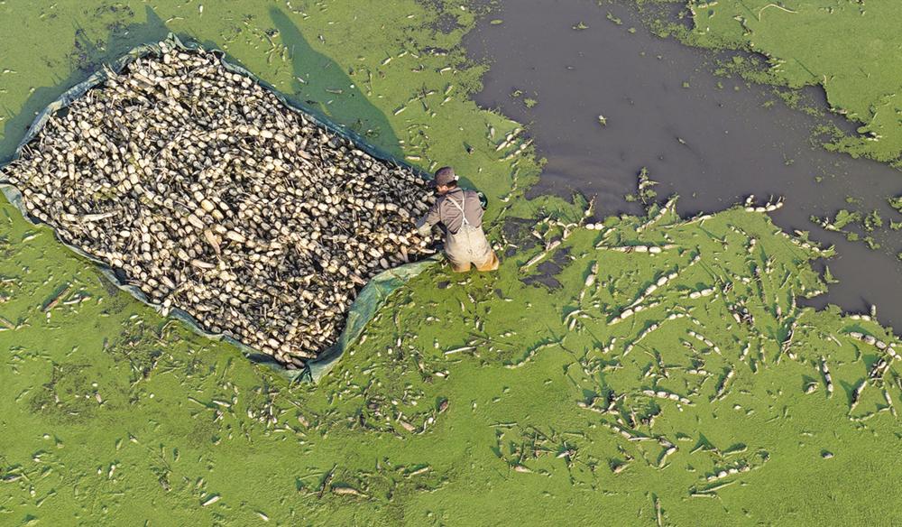 12月7日,江苏省海安市墩头镇一处浅水藕种植基地,藕农忙着采收浅水藕(无人机照片)。新华社发(周强 摄)
