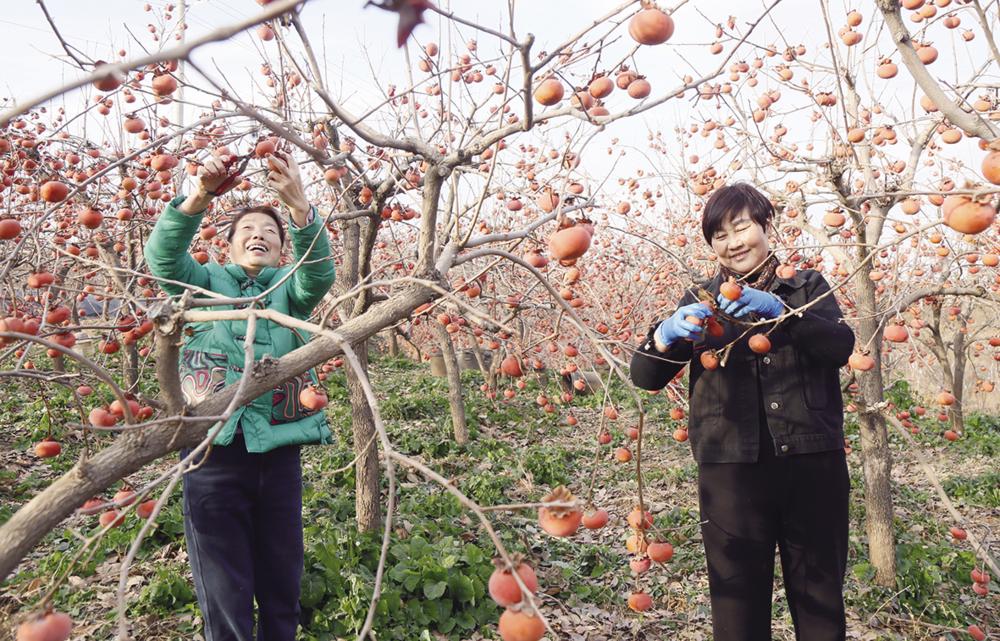 12月7日,在河南省洛阳市汝阳县三屯镇耿沟村温馨种植专业合作社,果农在采摘柿子。新华社发(康红军 摄)