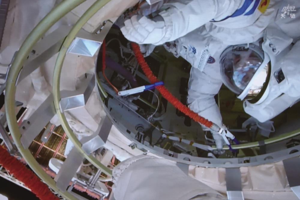 这是12月9日在北京航天飞行控制中心屏幕上拍摄的神舟二十一号乘组航天员武飞(上)向张陆传递设备。 据中国载人航天工程办公室介绍,12月9日10时28分,经过约8小时的出舱活动,神舟二十一号乘组航天员张陆、武飞、张洪章密切协同,圆满完成第一次出舱活动,完成了神舟二十号飞船返回舱舷窗巡检拍照等任务。 新华社记者 刘艺 摄