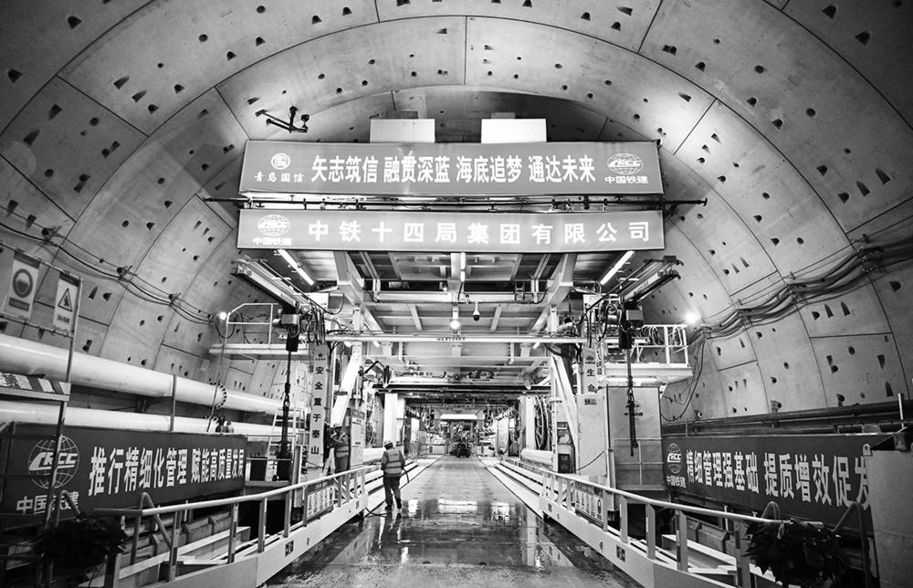 12月15日拍摄的青岛胶州湾第二隧道南线主线隧道盾构段作业面。 12月15日,青岛胶州湾第二隧道南线主线隧道盾构段成功穿越多条海底破碎带,掘进突破3000米,按时完成预定施工目标。青岛胶州湾第二隧道连接青岛主城区和国家级新区青岛西海岸新区,设计时速80公里。工程全长17.48公里,其中主线隧道长14.37公里,包括长达9.95公里的海域段。新华社记者 李紫恒 摄