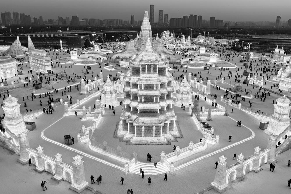 这是12月17日拍摄的哈尔滨冰雪大世界园区内的冰建景观(无人机照片)。