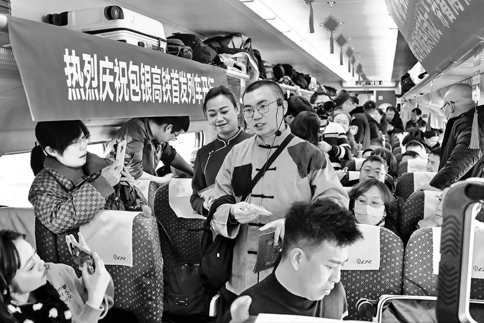 12月23日,工作人员(中)在D4667次动车组列车上与旅客互动。 12月23日,包银高铁包惠段正式建成通车,包银高铁全线贯通运营,“八纵八横”高速铁路网京兰通道全线贯通,完善了西北地区高铁路网,为新时代西部大开发注入新动能。 新华社记者 李志鹏 摄