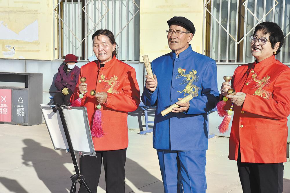 冬日的都兰县察汗乌苏镇上滩东村,天朗气清,村庄静谧。忽然,一阵悠扬欢快的曲调从村广场传来,夹杂着清脆的板胡与深情的演唱。