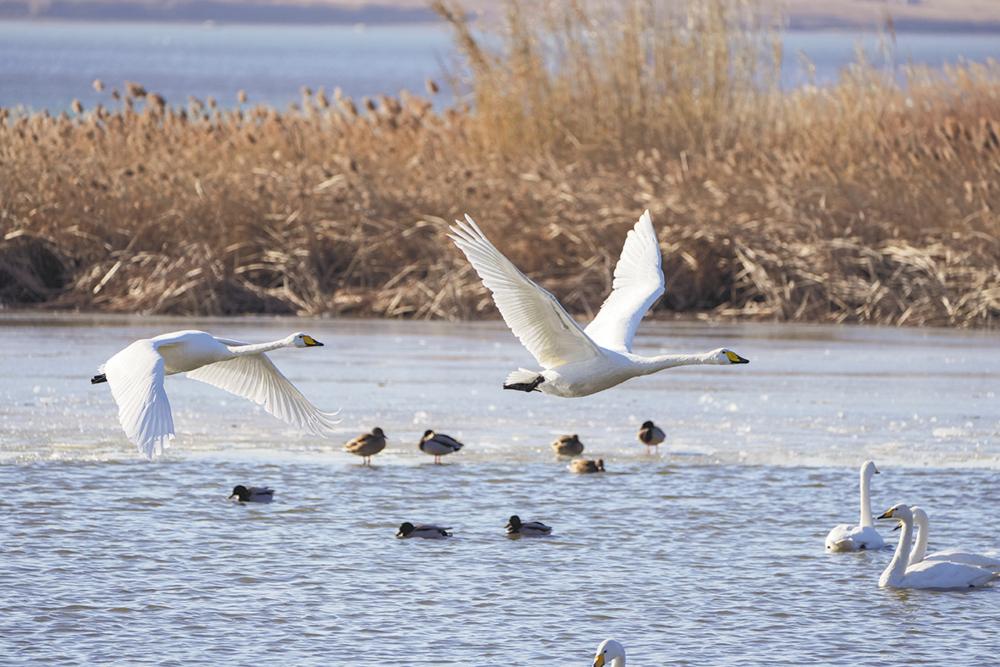 1月5日,大天鹅在荣成大天鹅国家级自然保护区飞翔。 入冬以来,大批大天鹅在山东省荣成市越冬,目前飞抵荣成越冬栖息的大天鹅数量已超过6000只。山东荣成是鸟类南迁北移的重要中转站,也是亚洲主要的大天鹅越冬栖息地之一,每年有大量大天鹅从西伯利亚等地来此越冬。 新华社记者 徐速绘 摄