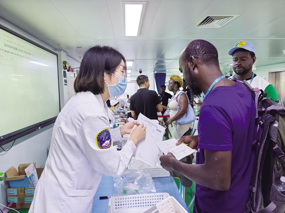 12月22日,中国海军“丝路方舟”号医院船在巴巴多斯开展医疗服务,医护人员为患者讲解用药须知。 中国海军“丝路方舟”号医院船27日圆满结束对巴巴多斯为期7天的友好访问和医疗服务,起航前往南美洲,继续执行“和谐使命-2025”任务。 新华社发(崔晓洋 摄)