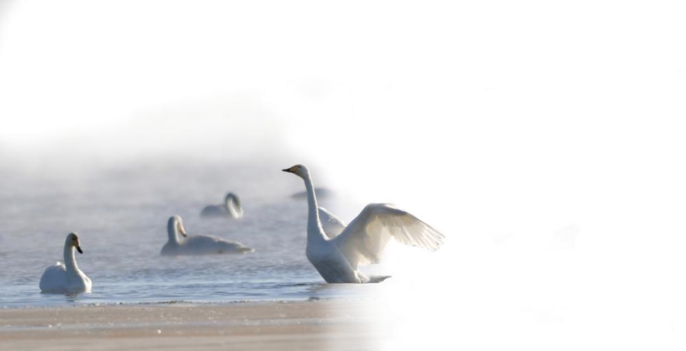十点多,车子刚到可鲁克湖边,就见湖面被一层晨雾裹着,朦胧得像幅画。忽然,一群白色身影在雾里晃动——是天鹅!大家瞬间来了精神,冻得发僵的手脚都好像灵活了些。有七八年观鸟经验的水鸟监测员郭晓龙立刻举起望远镜,扫了一圈湖面就报出大概数量:“大天鹅,估计七八十只。”说完,他干脆踩着车门登上车顶,找了个更高的视角仔细观测。