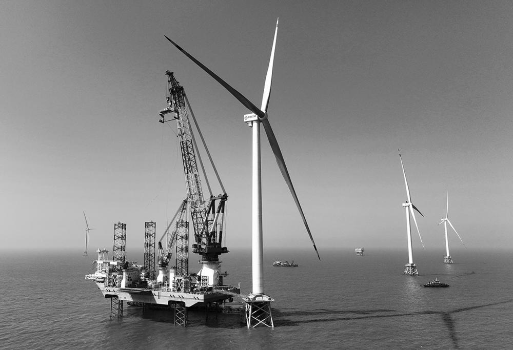 1月13日在闽南海域拍摄的“大桥海风”号2000吨自升式海上风电安装平台和吊装完成的20兆瓦海上风电机组(无人机照片)。 1月13日,由三峡集团与金风科技联合设计建造和示范应用的20兆瓦海上风电机组在福建闽南海域完成吊装。该机组的成功吊装,是我国海上风电大容量机型应用的又一重要突破。 新华社记者 林善传 摄