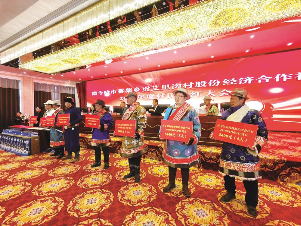 本报讯(记者 吴婷婷 巴俊) 近日,牧民们身着色彩鲜艳的民族服饰,笑容满面地聚集在一起,共同迎来村里历史性的一刻——德令哈市蓄集乡贡艾里沟村股份经济合作社2025年度村民分红大会在这里举行。