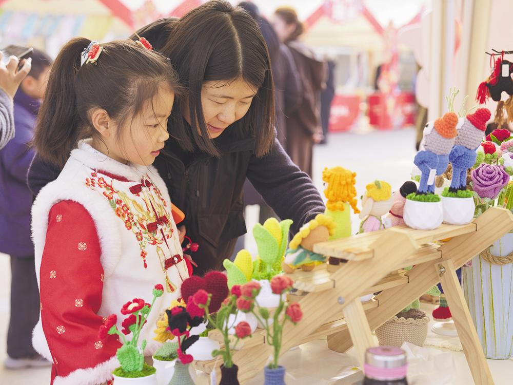 2月11日,市民在村糖会现场选购毛线手工艺品。 2月11日,以“逛村糖会·品新津味”为主题的春节村糖会在四川省成都市新津区天府农博园开幕迎客。非遗展示、民俗表演、年货展销同步上线,传统技艺与新春氛围交融。 新华社记者 刘坤 摄