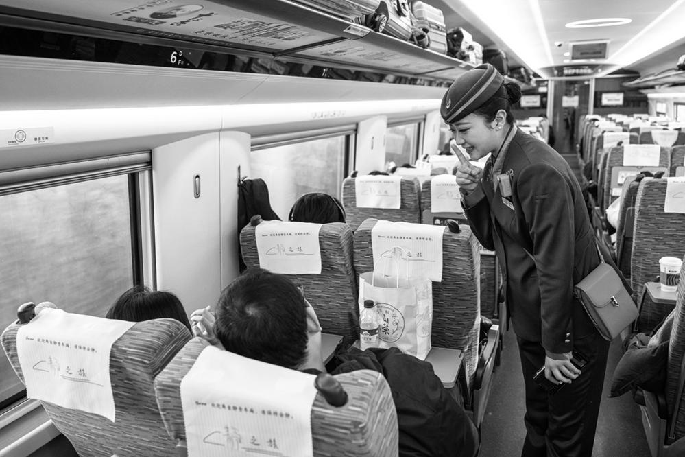 2月12日,在G458次列车的“静音车厢”,乘务员对旅客进行友好提醒。 今年春运期间,全国超8000列动车组列车的“静音车厢”,以精细化服务安静守护旅客的返乡路。新华社记者 伍志尊 摄