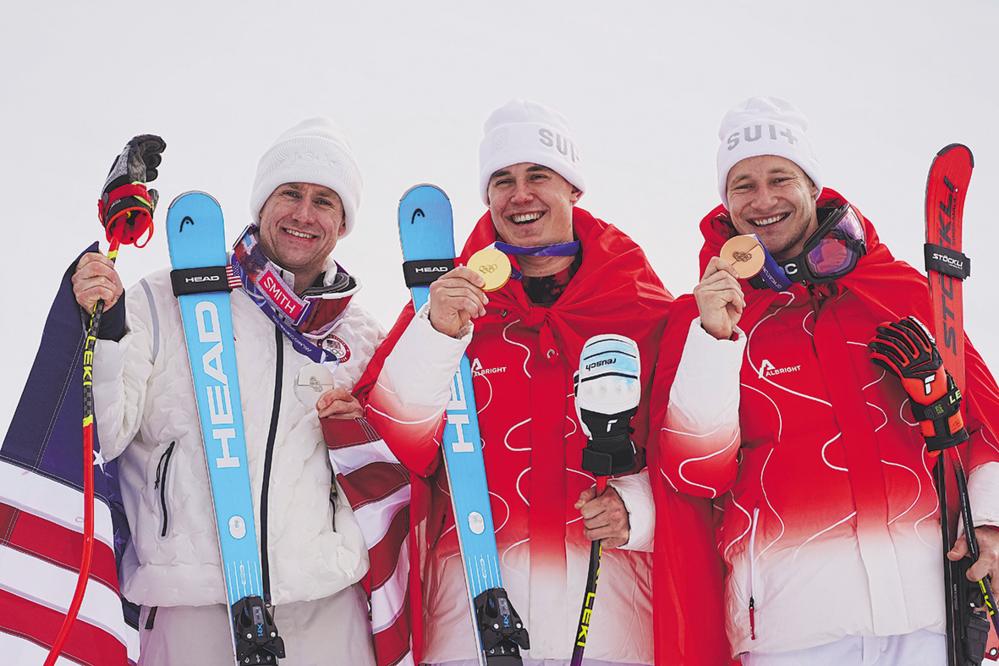 ↑2月11日,冠军瑞士选手冯阿尔曼(中)、亚军美国选手瑞安·科克伦—西格尔(左)与季军瑞士选手马尔科·奥德马特在颁奖仪式上。 当地时间2月11日,米兰—科尔蒂纳冬奥会高山滑雪男子超级大回转比赛在意大利博尔米奥举行。新华社记者 颜麟蕴 摄