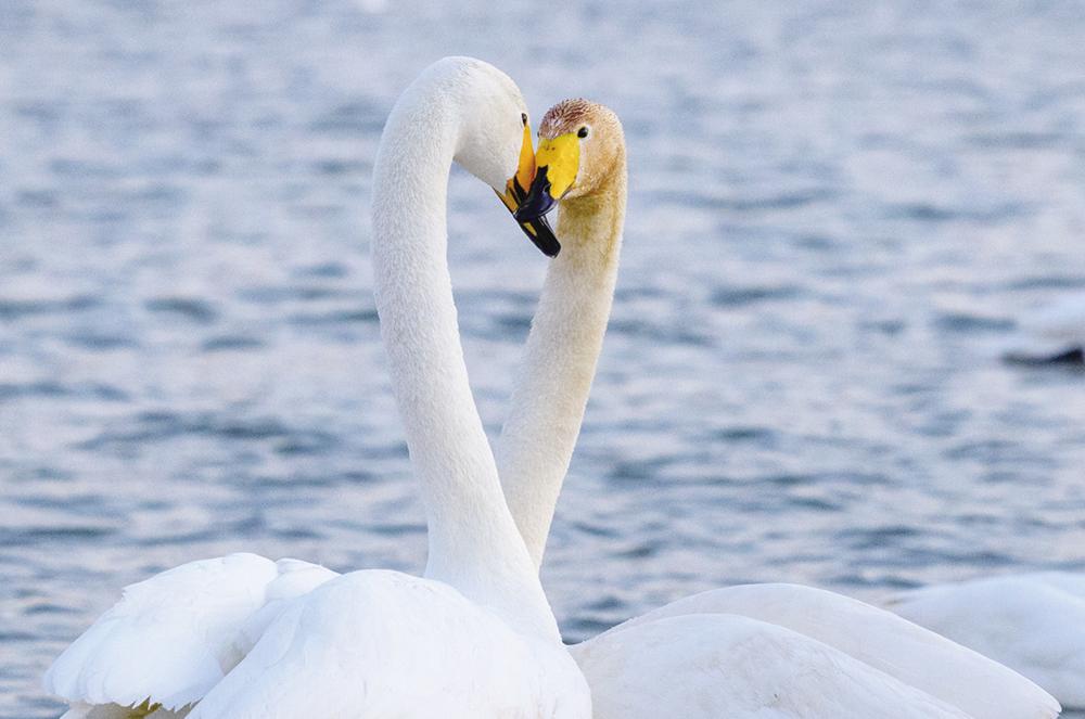2月24日,两只天鹅在大凌河朝阳市双塔区河段嬉戏。 冬季以来,大批天鹅飞临辽宁省朝阳市大凌河栖息越冬,吸引人们前来观赏和拍照。 新华社记者 胡竞文 摄