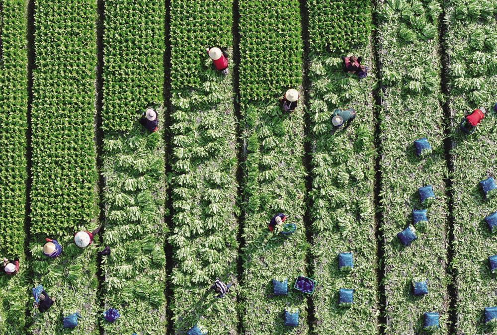 2月24日,农民在四川成都市彭州市九尺镇玉源社区的田地里采收油麦菜(无人机照片)。 时下,大江南北农事渐忙。各地农民抢抓农时、备耕备种、采收管护,田间地头一派忙碌景象。新华社发(罗国杨 摄)