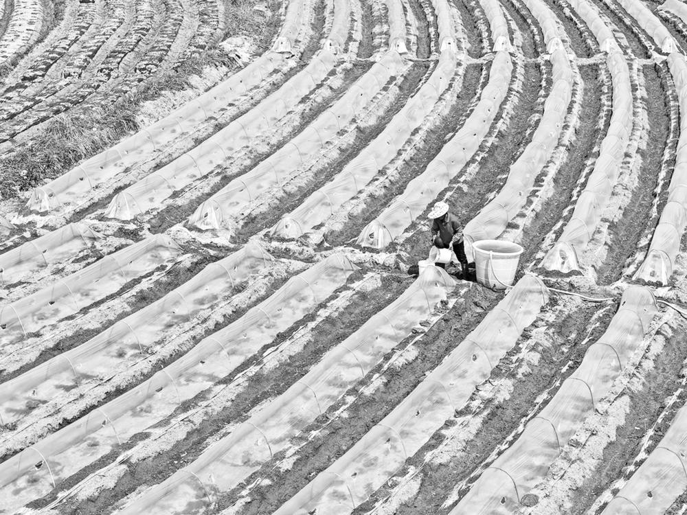 3月1日,村民在广西南宁市邕宁区蒲庙镇田园里管护(无人机照片)。 初春时节,广西南宁市邕宁区蒲庙镇村民忙着春耕春管,田园里一派繁忙景象。新华社记者 周华 摄