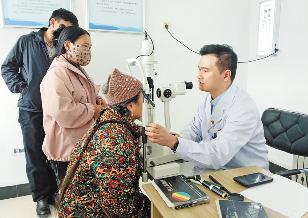 室外春寒料峭,诊室内却暖意融融。援青医生刘辉正俯身专注为藏族老人复查眼部病情,老人不通汉语,他便借助助理翻译逐句沟通,用手势引导检测,放慢语速反复叮嘱术后事项,眼底的真诚关切跨越语言隔阂,直抵患者心间。诊室墙面上,一面送给刘辉的“妙手拨云除内障 医者仁心照眼明”的锦旗熠熠生辉。