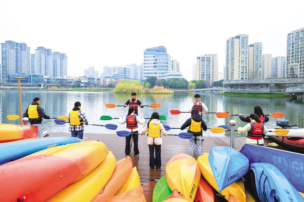 3月17日,在宁波市江北区甬江街道星湖公园,教练员(后)为参加水上运动公开课的青年学员讲解皮划艇桨的握法。 早春时节,一堂水上运动公开课在浙江省宁波市江北区甬江街道星湖公园进行。青年学员们划着皮划艇、桨板,在教练员指导下泛舟湖面,享受水上运动的乐趣。 2025年起,宁波市江北区青年夜校依托星湖公园水域与园内水上运动中心的专业设施,将桨板、皮划艇等项目纳入教学课程,使更多青年人在家门口就能体验水上运动。 新华社记者 江汉 摄